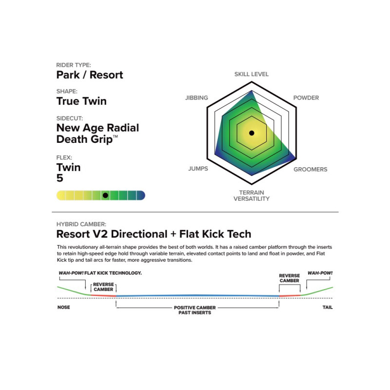camber RESORT V2 Directional + Flat Kick Tech Denne revolutionerende all-terrain-form giver det bedste fra begge verdener. Den har en hævet camber-platform gennem indsatserne for at bevare kantgrebet ved høj hastighed gennem varierende terræn, forhøjede kontaktpunkter for at lande og flyde i puddersne og Flat Kick tip- og tail-buer for hurtigere og mere aggressive overgange. SB RESORT TWIN